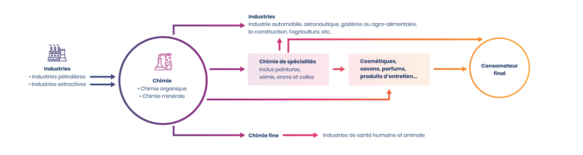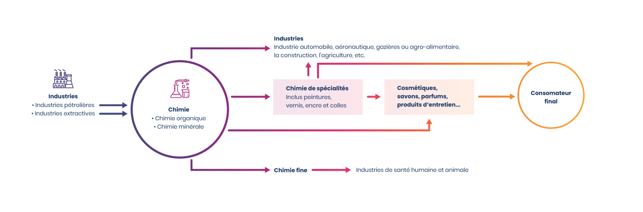 Les entreprises de la branche jouent un rôle clé dans la transition écologique et énergétique de l’industrie en France. La sensibilité croissante des consommateurs pour des produits plus verts, non nocifs et non toxiques, pousse les entreprises à revoir leurs processus de fabrication. Cela passe notamment par l’amélioration de la maîtrise énergétique et par la recherche de solutions nécessaires à une économie décarbonée. Les perspectives en la matière sont fortes : recyclage des plastiques et des batteries, traitement de l’eau et des effluents industriels, captation du CO2, dépollution, récupération des métaux et des produits rares, etc. Le recyclage chimique, sujet d’avenir pour les entreprises de la branche, est en pleine croissance et permet de réduire considérablement l’impact environnemental des activités.